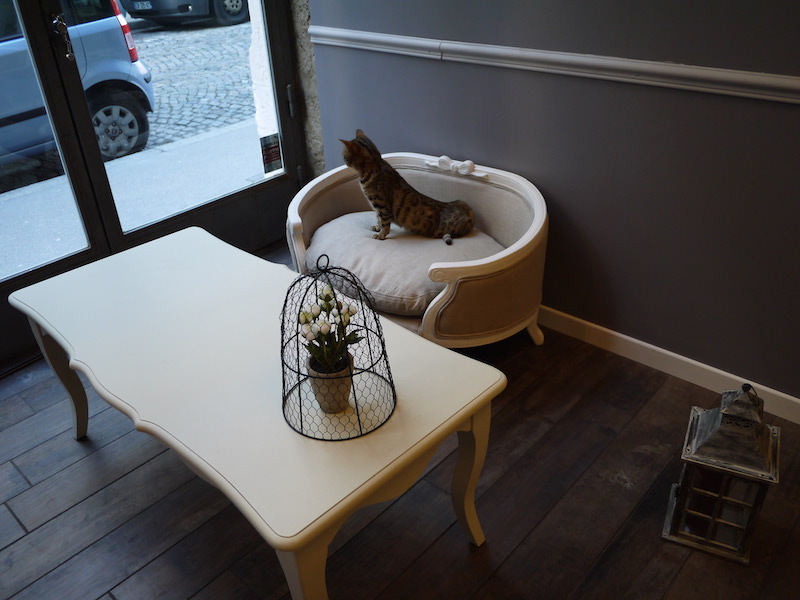 Pour les 6 stars des lieux, il y a tout un espace à l’étage (seulement accessible aux animaux et aux gérants) où elles peuvent se nourrir, boire et faire leurs besoins (bah oui hein elles ont le droit quand même ..) mais cela, ne gêne absolument pas la clientèle puisque le tout est vraiment bien pensé ! Il y a aussi un distributeur de gel désinfectant à l’entrée qui permet de pouvoir les caresser tout en assurant un bon niveau d’hygiène. Elles ont chacune leur fauteuil par ambiance, et se sont d’ailleurs bien adaptées, cela fait plus de 3 semaines qu’elles se sont appropriées les lieux et rien qu’à voir le « mode détente puissance 3 milliards » auquel j’ai assisté je peux vous dire que ça roule tranquille mimile … La preuve …. Et encore … J’ai pas osé trop les déranger pendant leur sieste ahah !